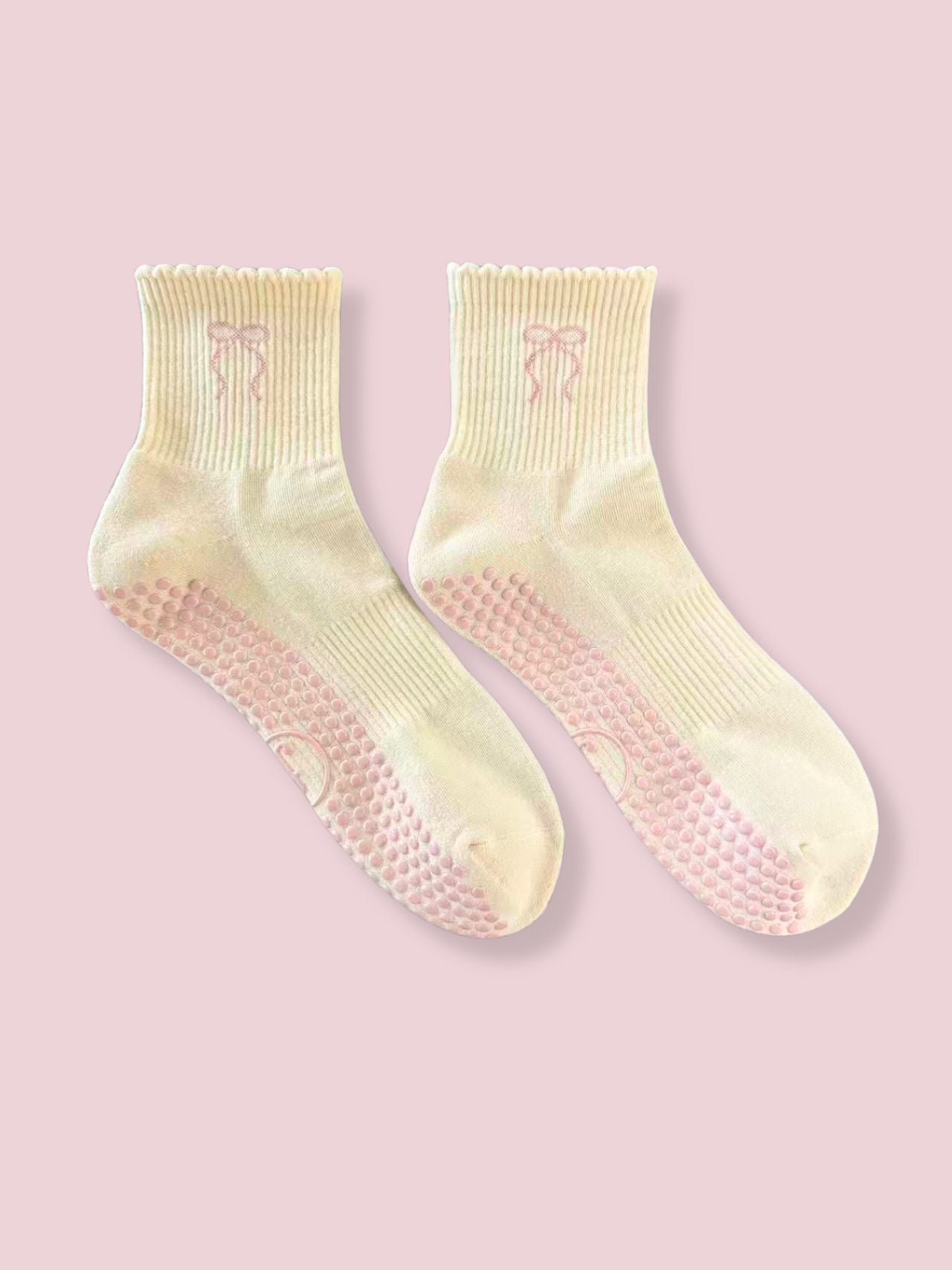Pretty in pink with a scalloped edge that’s giving ballet-core meets Pilates princess. These sweet grip socks feature a darling bow detail and delicate scalloped cuff that’ll have everyone in class asking where you got them.
